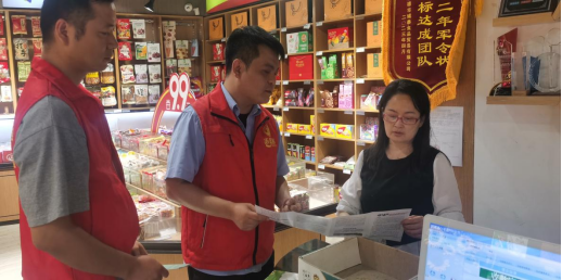 志愿者为门店老板及居民发放宣传手册,讲解相关政策