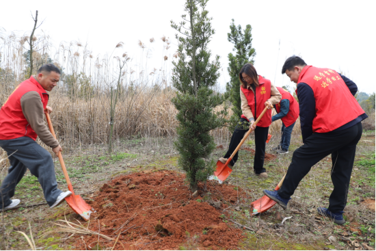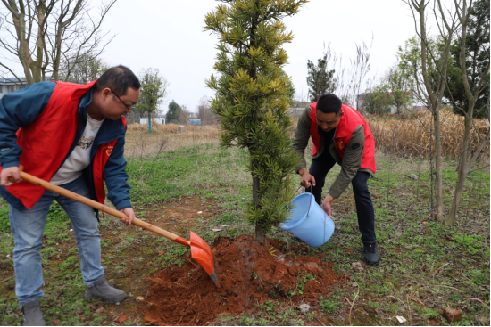 活动现场,党旗飘扬,红马甲闪耀。中心各党支部党员同志分工协作、干劲十足。有的挥锹挖坑、扶苗定植;有的培土踩实、浇水施肥;还有的为已成活苗木除草松土,细心呵护每一株绿植茁壮成长。春日暖阳下,大家相互帮助、相互配合,忙碌的身影成为山坡上一道亮丽的风景线。短短一小时内,原本略显空旷的后山坡焕然一新,逐渐形成一片生机盎然的绿化景观带。