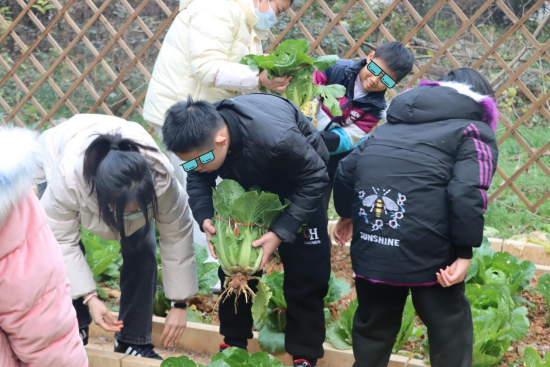 志愿者与儿童采摘白菜