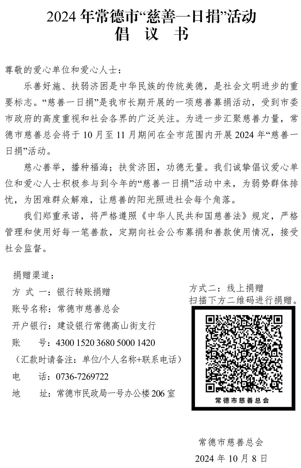 为深入贯彻党的二十大精神和习近平总书记关于慈善工作的重要论述,引导更多有意愿有能力的爱心单位、组织和个人积极参与公益慈善事业,弘扬中华民族扶贫济困的传统美德,发挥好慈善事业第三次分配作用,根据《中华人民共和国慈善法》规定,常德市慈善总会决定在全市范围内开展2024年“慈善一日捐”活动。