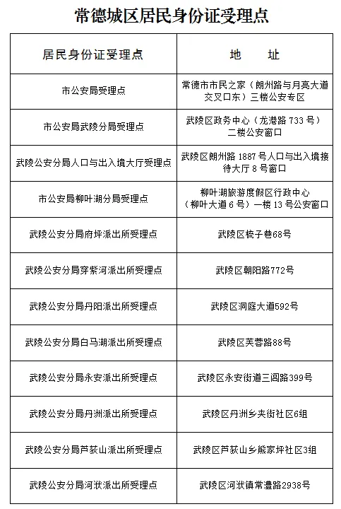 省外户籍居民,您可以就近选择市民之家身份证窗口、武陵区政务中心或柳叶湖区旅游度假区行政中心身份证窗口办理;省内户籍居民,您可以就近选择任一身份证受理点办理。办证地址附后。