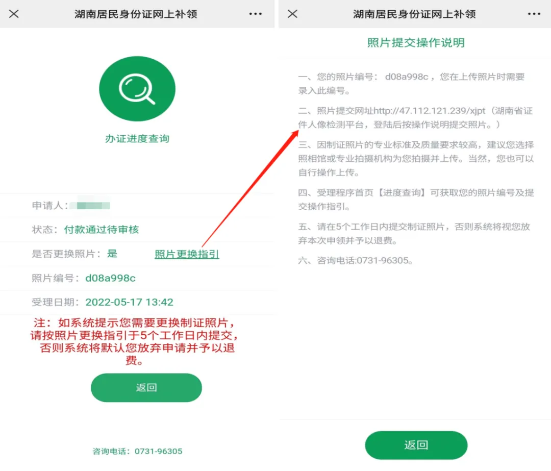 申请人申领登记完成后,系统将分配唯一的相片编号,编号可在“进度查询”功能中查看。申请人需按照相片提交操作说明,登录“湖南省证件人像检测服务平台”,提交符合制证标准的电子照片。