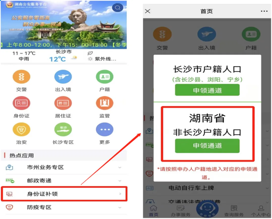 进入首页【热点应用】,点击【身份证补领】,根据户籍地选择申领通道。